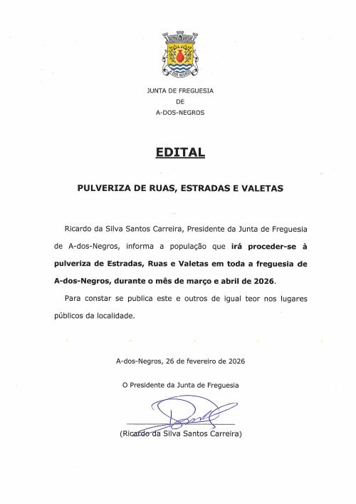 Aviso - Consulta Pública - Projeto Regulamento Serviço Recolha Resíduos Verdes e Resíduos de Construção e Demolição da Freguesia de A dos Negros